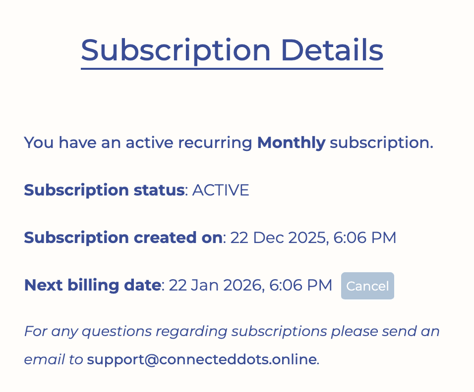 If you run into problems with the payment process, please feel free to send an email to support@connecteddots.online.